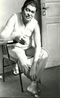 Retrato em preto e branco de Cintura Fina, uma pessoa com pele escura sentada em um carteira escolar. Seu rosto é bem definido, com cabelos ondulados e pretos, sobrancelhas grossas e olhos cerrados. Os lábios também estão fechados, e seu olhar está direcionado para a câmera. Usa camiseta manga curta clara e calças claras, a mão direita repousa na mesa lateral da carteira enquanto a outra, caída, repousa em sua coxa esquerda. Em seus pés usa chinelos e do lado direito há uma porta aberta.