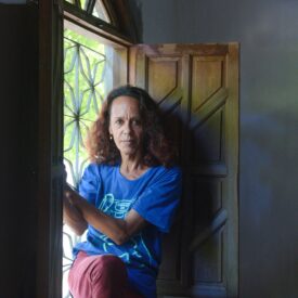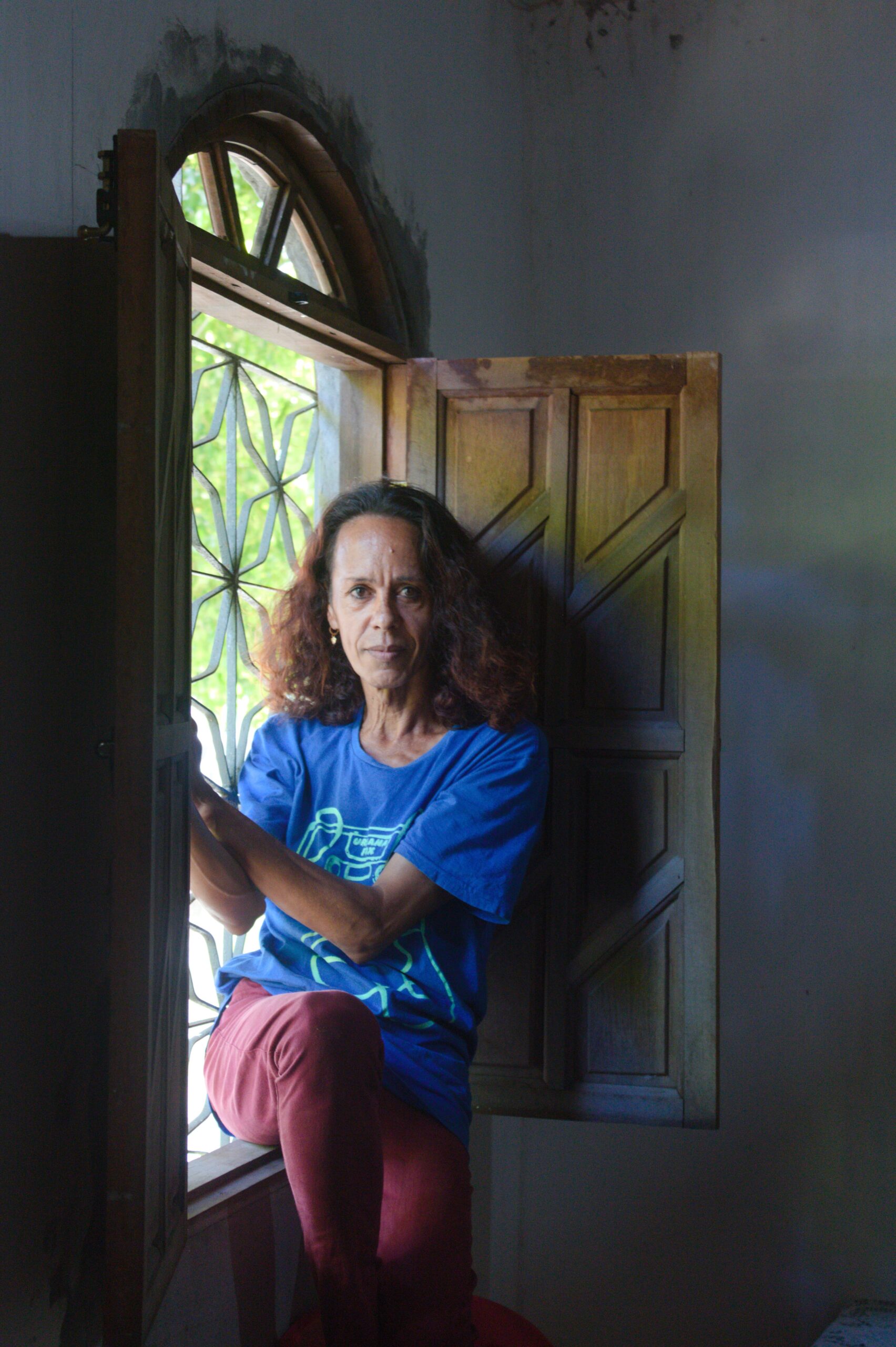Foto de Fabiane Galvão, sentada com uma expressão séria na beirada interna de uma janela gradeada. Fabiane veste uma camiseta azul, com estampa de fita cassete, e uma calça na cor marsala. Ela tem as duas mãos apoiadas na lateral da janela. Do lado de fora, além da grade, é possível ver a copa das árvores.