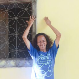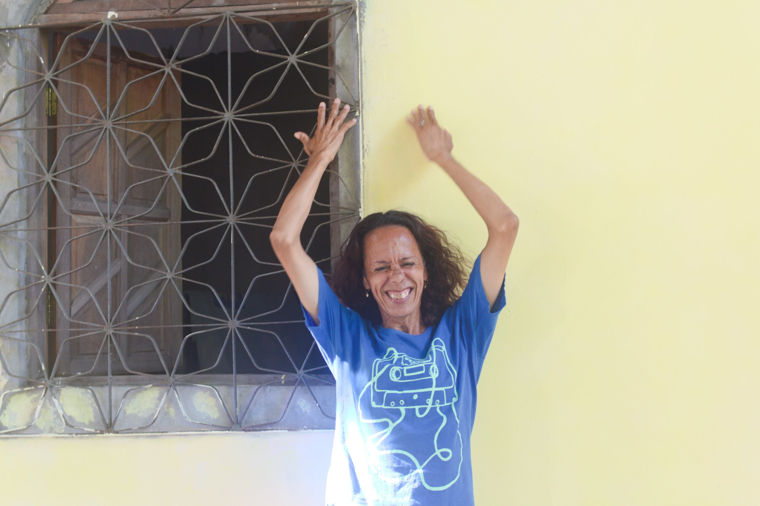 Fotografia digital de Fabiane Galvão. Ela se encontra no centro da foto, sorrindo de olhos fechados, com os braços levantados acima da cabeça. Ela veste uma camiseta azul com estampa de fita cassete. Atrás de Fabiane há uma parede amarela. À esquerda da foto, pode-se ver uma janela com grade.