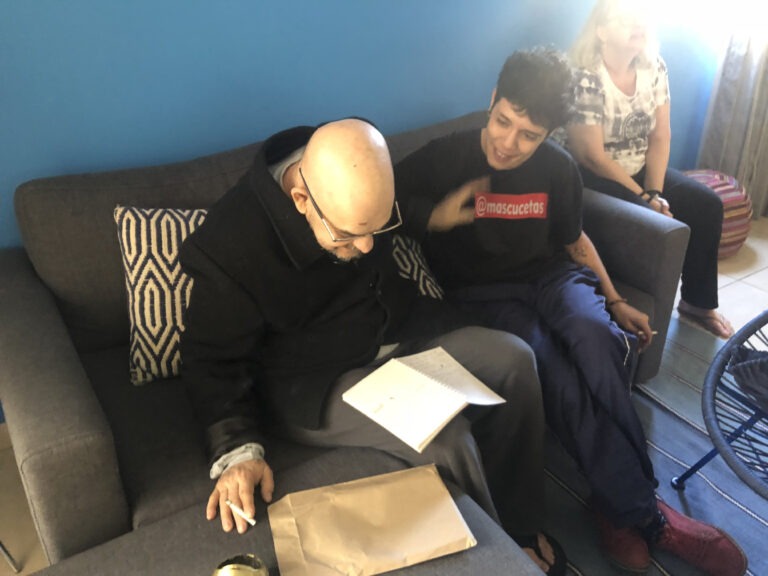 Fotografia colorida. Duas pessoas sentadas em um sofá cinza com almofada geométrica. João W Nery, um homem branco, careca, usando óculos e com casaco preto senta-se inclinado para...