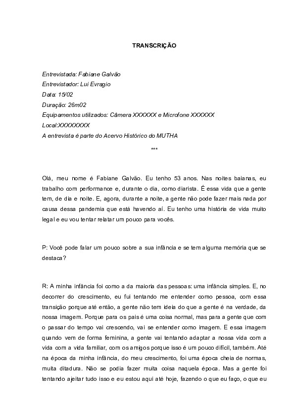 Documento no Google Docs, contendo a transcrição em texto da gravação da entrevista com Fabiane Galvão