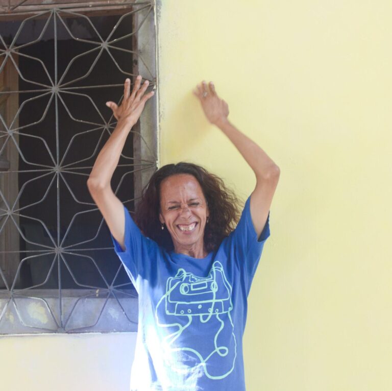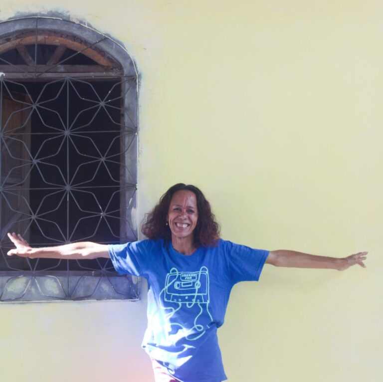 Fotografia digital de Fabiane Galvão. Ela se encontra no centro da foto, sorrindo, com os braços abertos, vestindo uma camiseta azul com estampa de fita cassete. Atrás de...