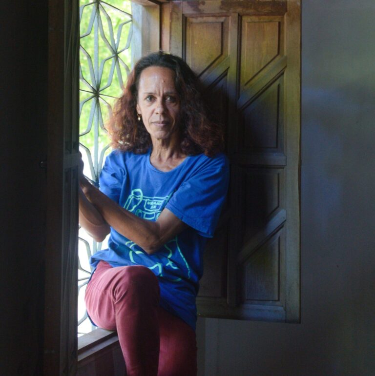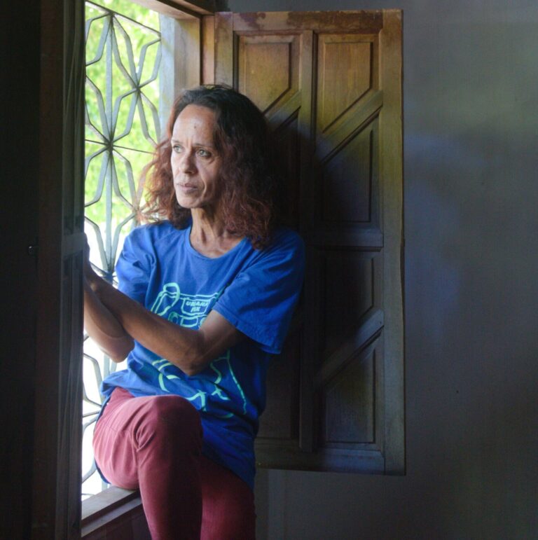 Foto de Fabiane Galvão, sentada com uma expressão séria na beirada interna de uma janela gradeada. Fabiane olha para o lado de fora. Ela veste uma camiseta azul,...