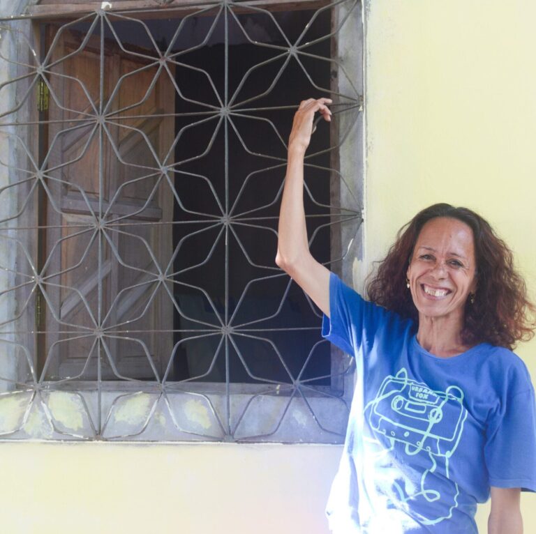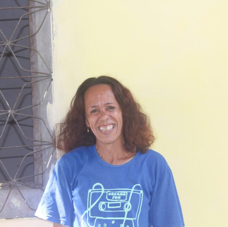 Foto de Fabiane Galvão, sentada com expressão sorridente na beirada interna de uma janela gradeada. Fabiane veste uma camiseta azul, com estampa de fita cassete, e uma calça...