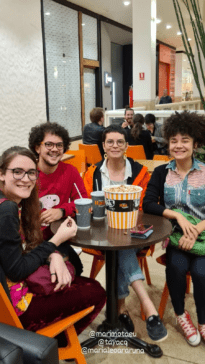Maria Léo Araruna, Bernardo Mota, Taya Carneiro e Mariana Mota, da direita para a esquerda. Sentadas ao redor de uma mesa preta com cadeiras laranjas, quatro pessoas posam para a foto e sorriem. À esquerda, uma pessoa de pele branca, com nariz fino e lábios delicados, veste uma blusa preta com estampas amarelas e rosas, combinada com uma calça aveludada vermelha. Ao seu lado, um rapaz de cabelos encaracolados, pele branca, nariz largo e barba, usa óculos de hastes amarelas e pretas. Ele veste uma blusa vermelha estampada com um cachorrinho branco, o personagem Snoopy. Seguindo para a próxima pessoa, uma jovem de cabelos curtos e óculos de armação preta sorri timidamente. Ela veste uma camisa branca com um casaco preto e laranja por cima, calça jeans e tênis preto. Por fim, à direita, uma jovem com cabelos encaracolados presos no topo da cabeça, exibe um sorriso largo. Ela veste uma camisa estampada em tons de laranja e verde, segura uma bolsa verde, usa calça preta e um All Star vermelho.